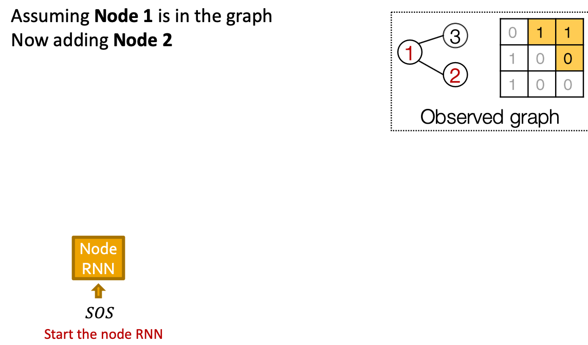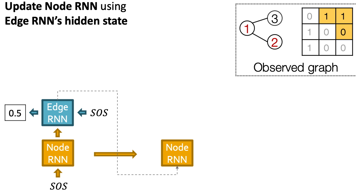 - Add another new node: We use the last hidden state of Edge RNN to run Node RNN for another step