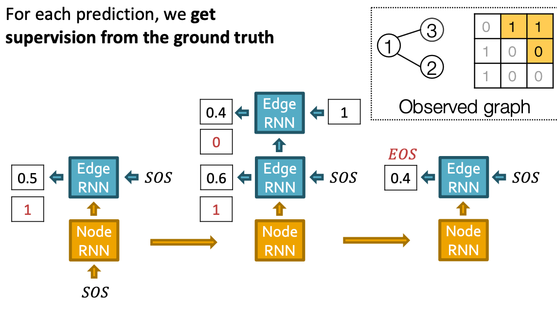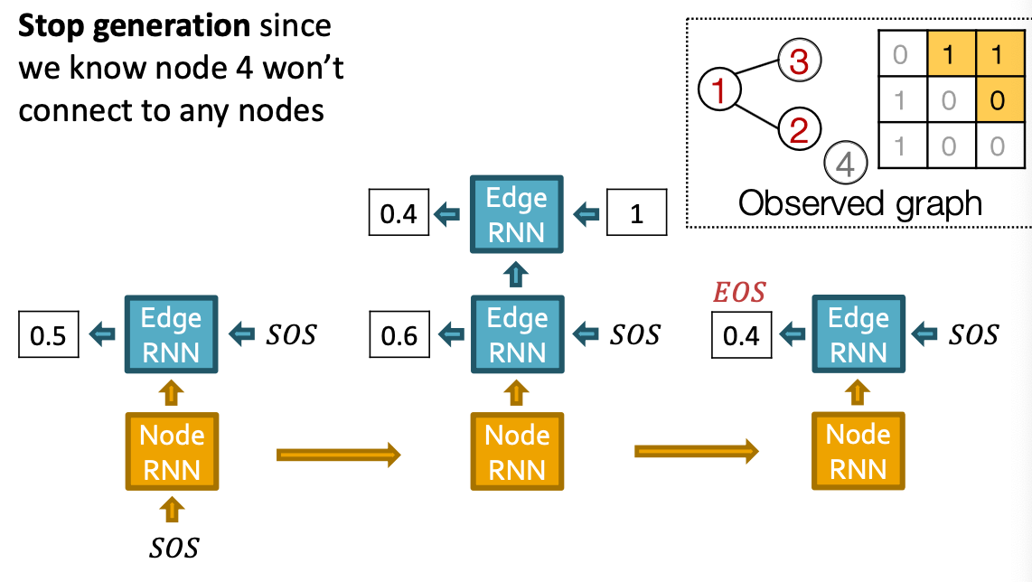 - Stop graph generation: If Edge RNN outputs EOS at step 1, we know no edges are connected to the new node. We stop the graph generation.