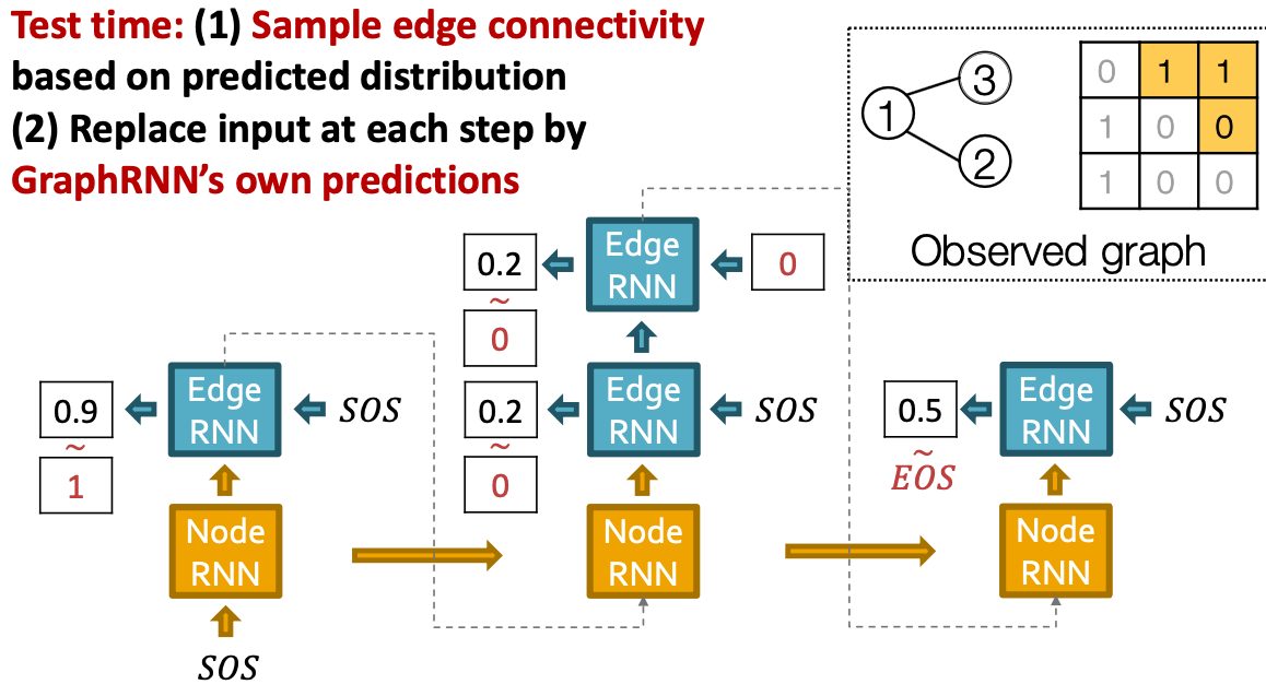 - Add new edges for the new node: We run Edge RNN to predict if the new node will connect to each of the previous node.