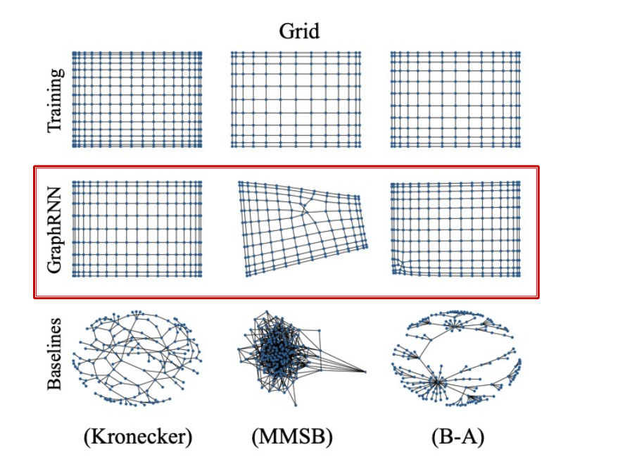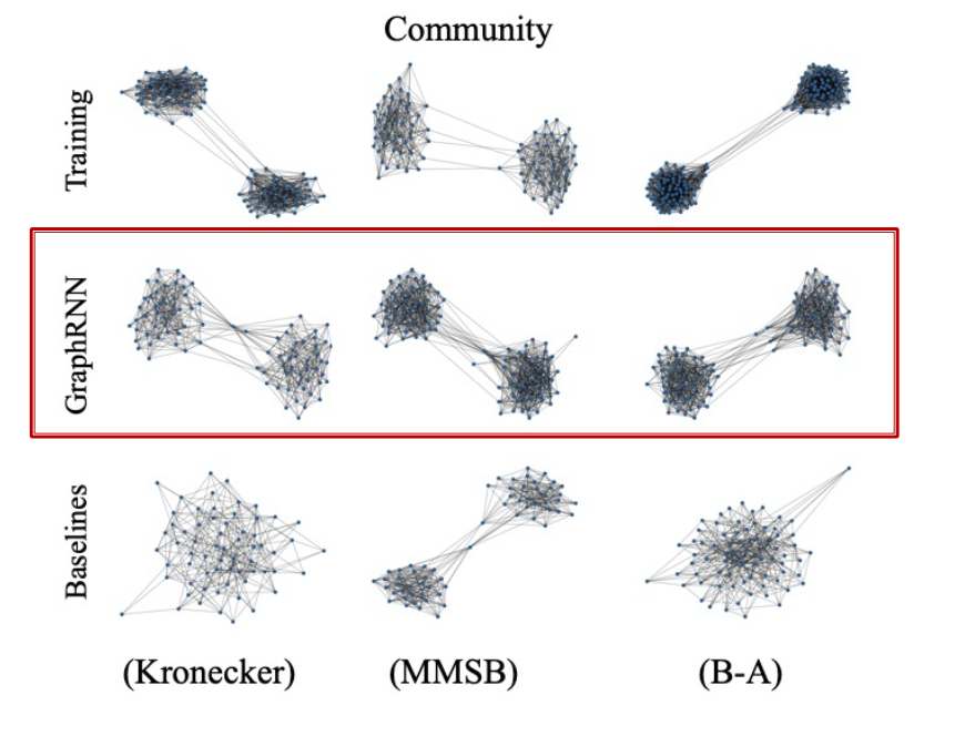- GraphRNN has a node-level RNN and an edge-level RNN