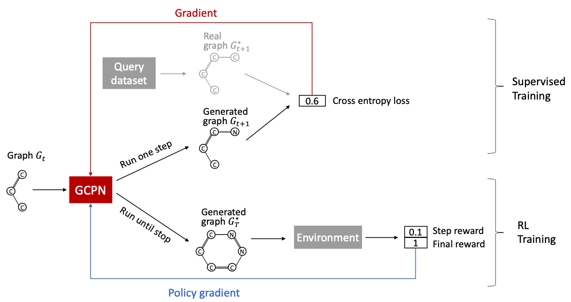 - GCPN further uses RL to direct graph generation to our goals