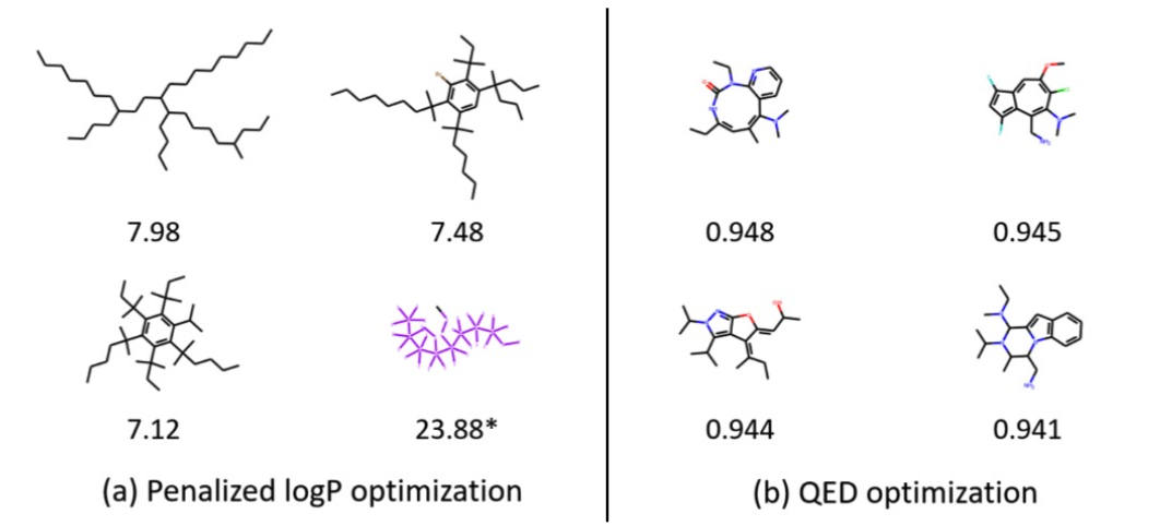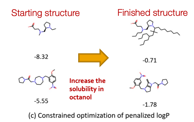 - Constrained Optimization: Edit a given molecule for a few steps to achieve higher property score