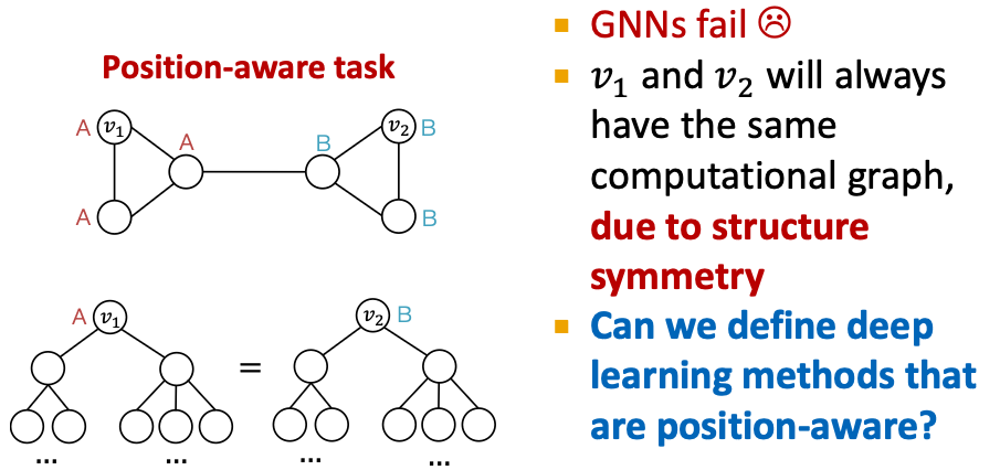 - GNNs would fail for position-aware tasks.