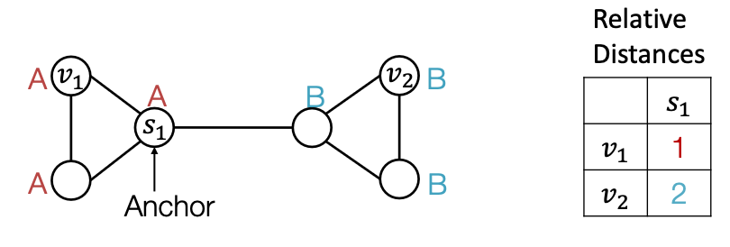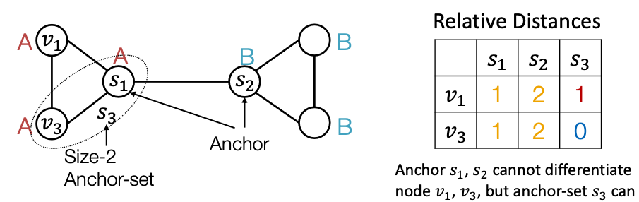 - We define distance to an anchor-set as the minimum distance to all the nodes in the ancho-set.