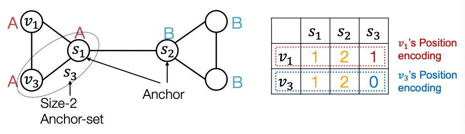 - Position encoding for graphs: Represent a node’s position by its distance to randomly selected anchor-sets