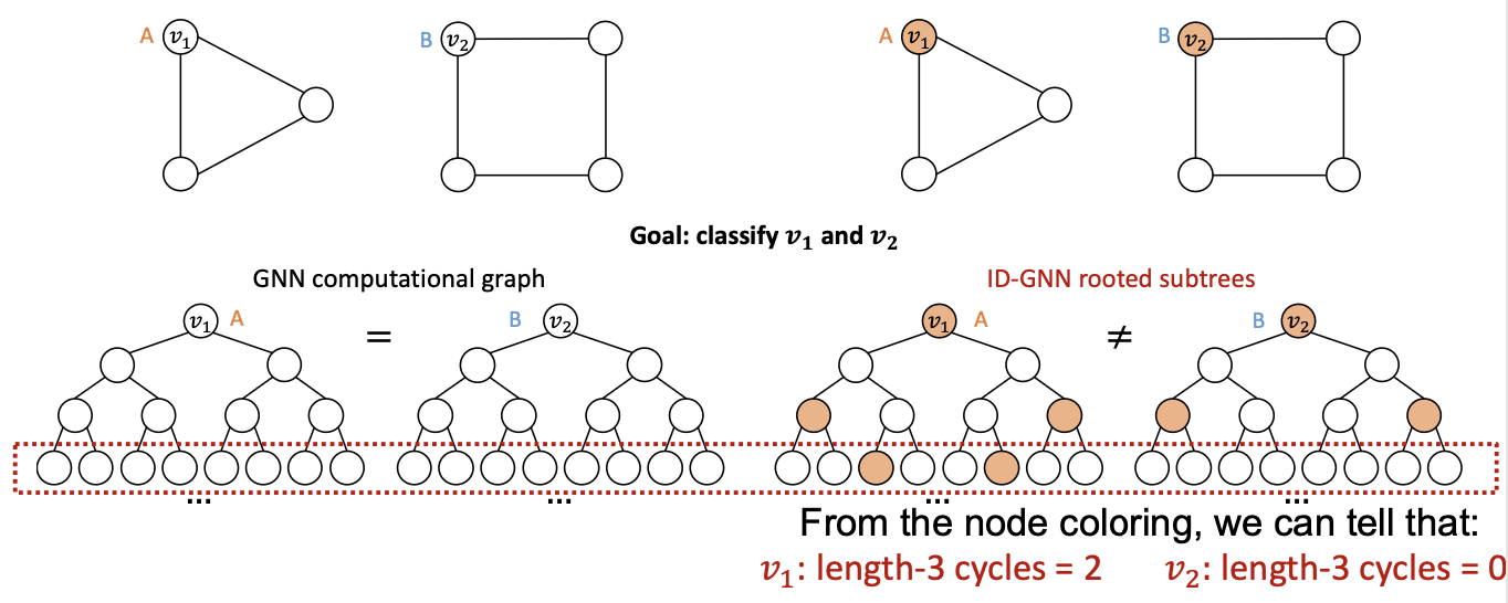 - Intuition: ID-GNN can count cycles originating from a given node, but GNN cannot.