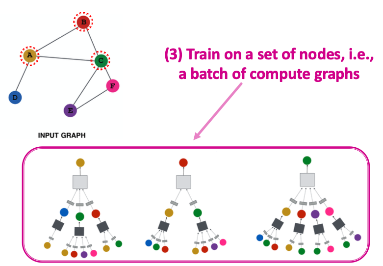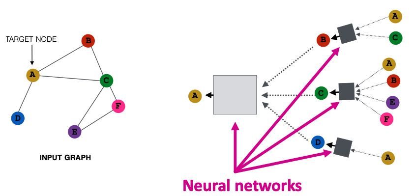 - Nodes aggregate information from their neighbors using neural networks (上图)