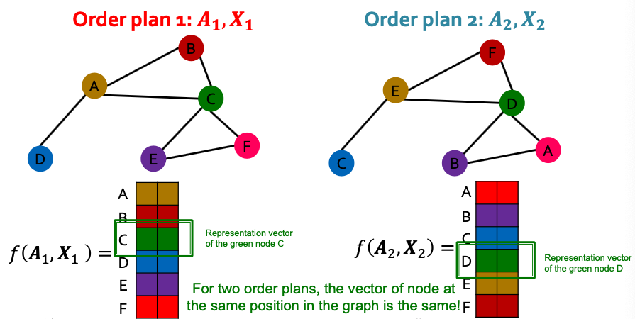 - If the output vector of a node at the same position in the graph remains unchanged for any order plan, we say is permutation equivariant.