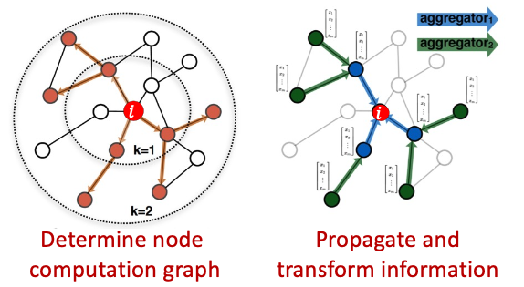- Layer-k embedding gets information from nodes that are hops away