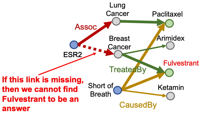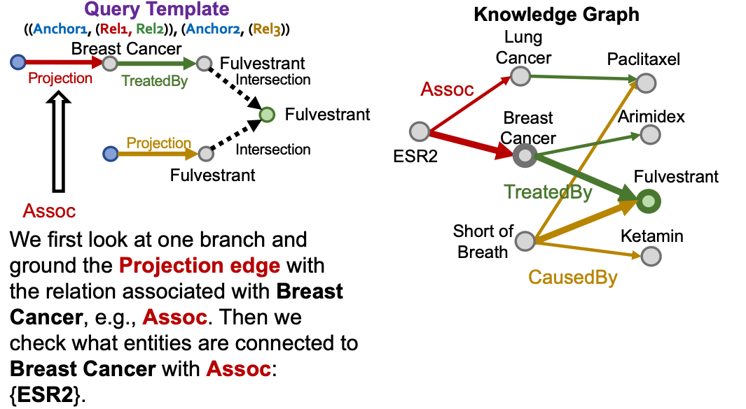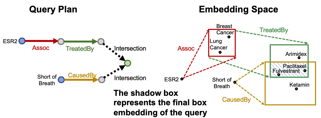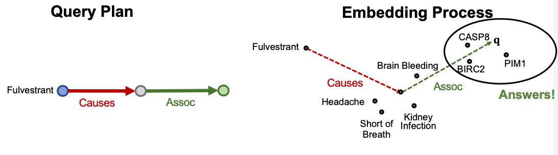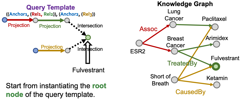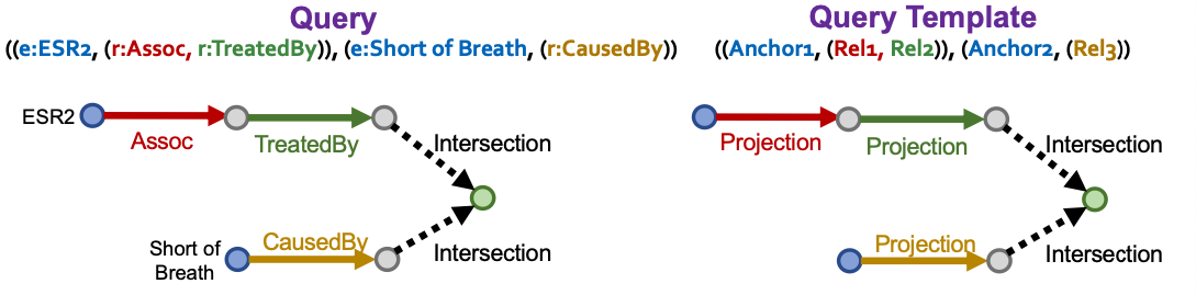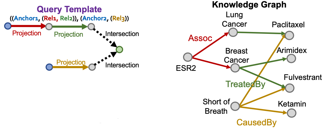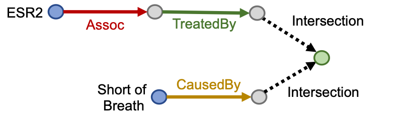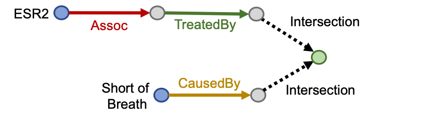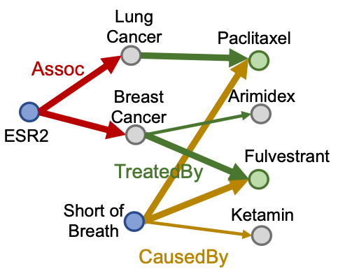 - Conjunctive Queries: “What are drugs that cause Short of Breath and treat diseases associated with protein ESR2?” ((e:ESR2,(r:Assoc,r:TreatedBy)),(e:Short of Breath,(r:CausedBy)))