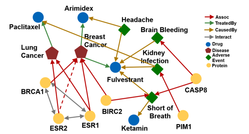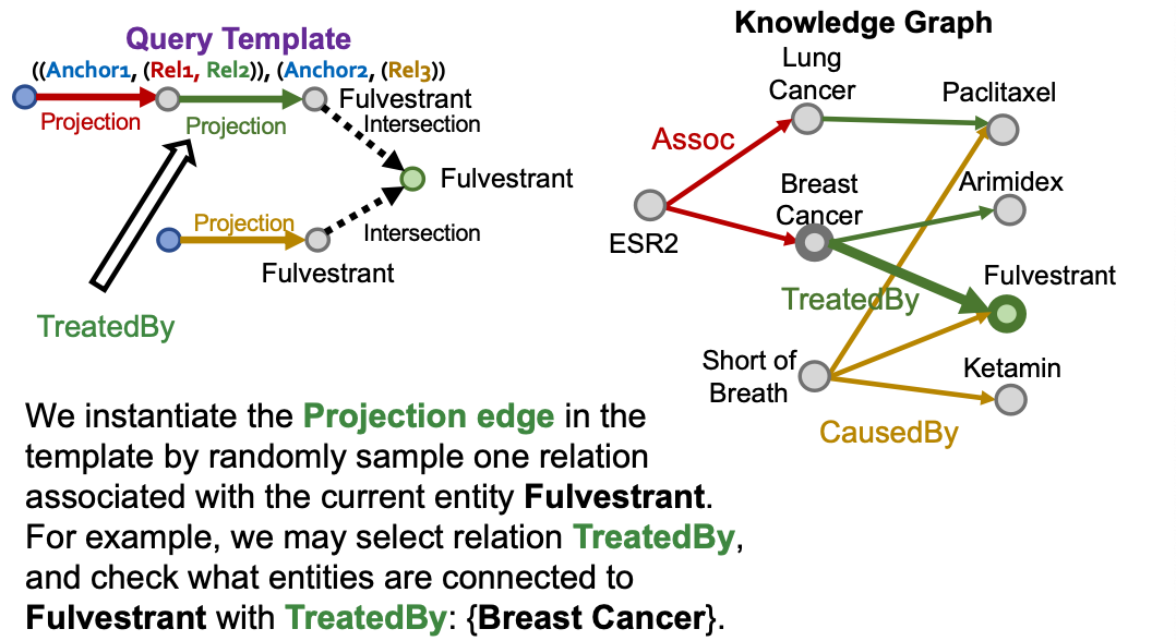 - Example: What is the drug that treats breast cancer and caused headache? ((e: BreastCancer,(r: TreatedBy)),(e: Migraine, (r: CausedBy)))