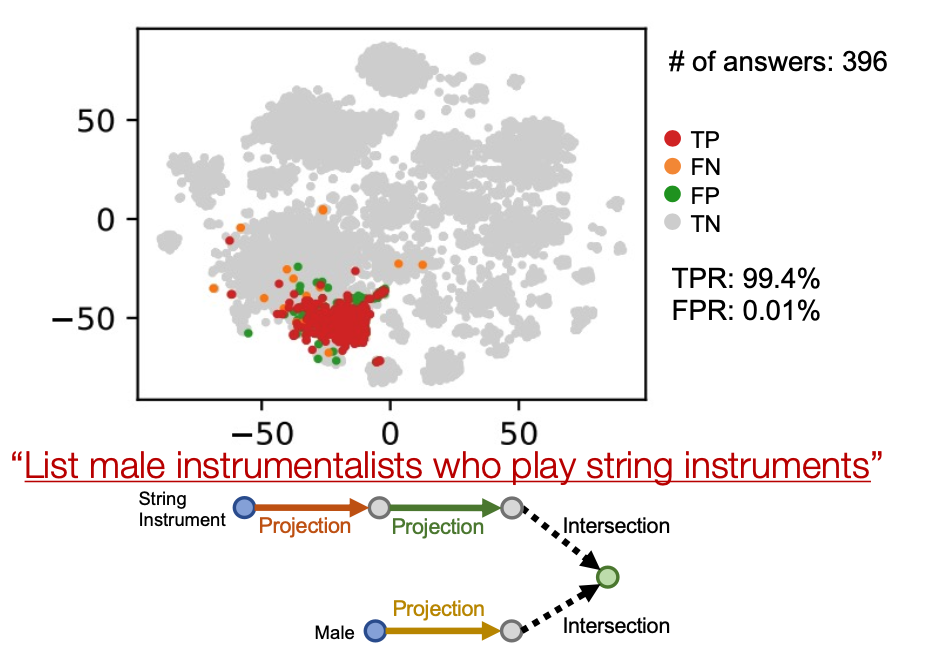 - Query2Box: Embed query into a hyper-rectangle (Box) in the Euclidean space: answer nodes are enclosed in the box.